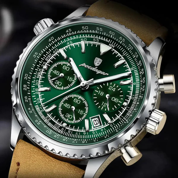 | Funções | Cronógrafo • Data automática • Ponteiros luminosos • Resistente à água |